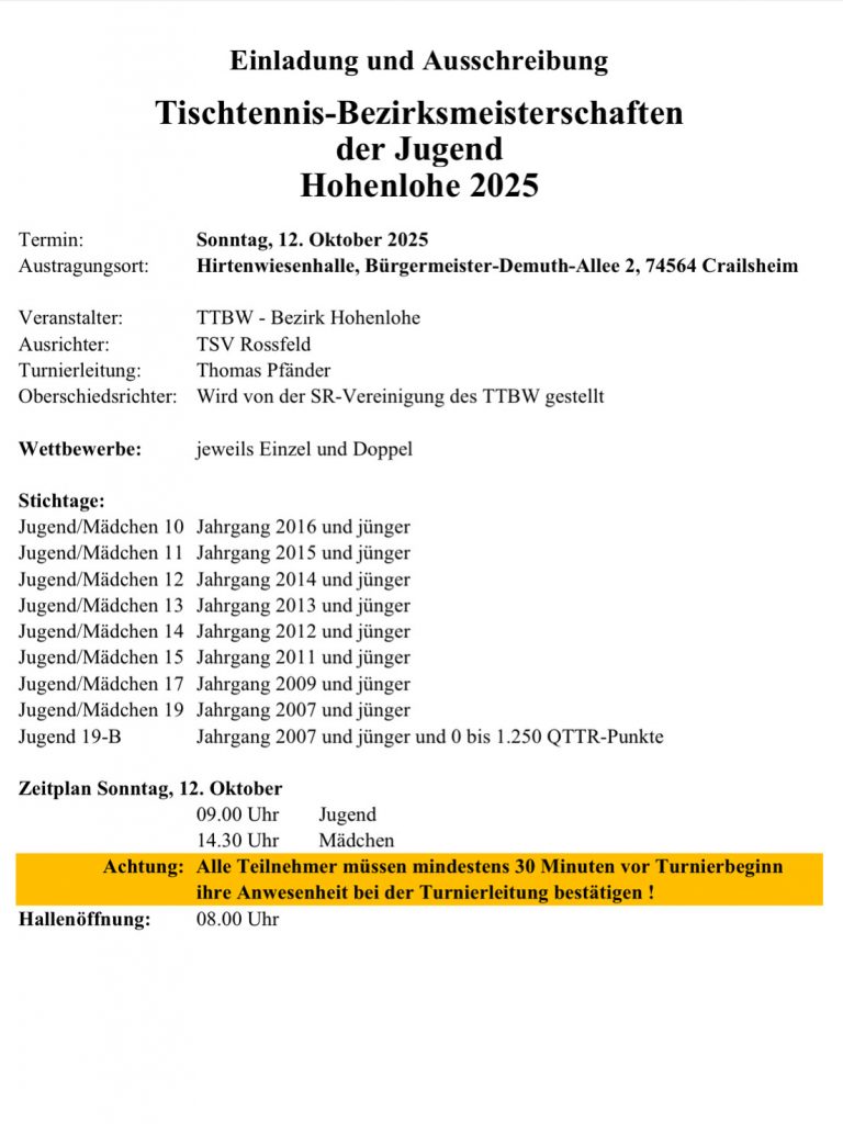 Morgen finden die Bezirksjugendmeisterschaften des Hohenloher Bezirks statt. Alle Infos findet ihr unter folgendem Link.