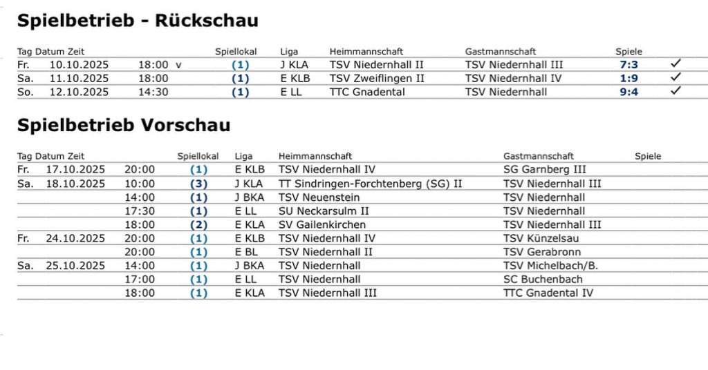 Das sind die Ergebnisse vom TSV Niedernhall vom Wochenende. Herzlichen Glückwunsch an Niedernhall zu dem 9 zu 1 gegen den TSV Zweiflingen am Samstag.